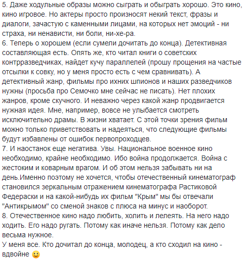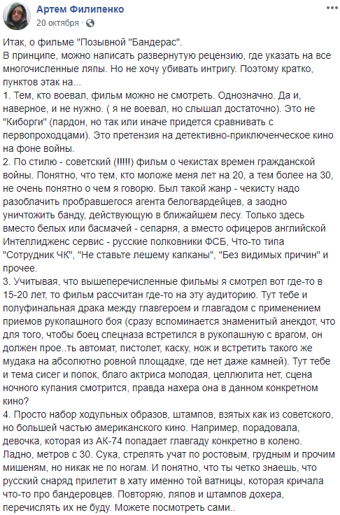"Просто набор ходульных образов, штампов, взятых как из советского, но большей частью американского кино. Например, порадовала, девочка, которая из АК-74 попадает главгаду конкретно в колено. Ладно, метров с 30. Сука, стрелять учат по ростовым, грудным и прочим мишеням, но никак не по ногам. И понятно, что ты четко знаешь, что русский снаряд прилетит в хату именно той ватницы, которая кричала что-то про бандеровцев. Повторяю, ляпов и штампов дохера, перечислять их не буду. Можете посмотреть сами...