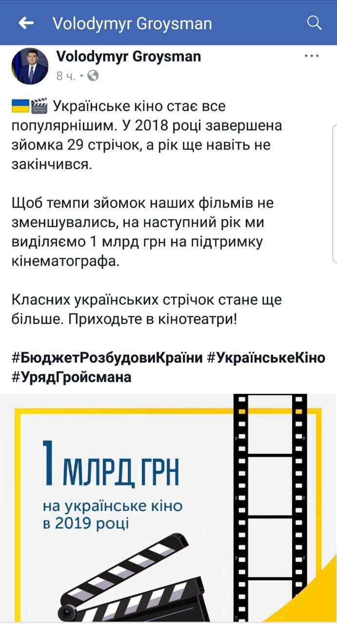Объемами потенциального финансирования на своей странице в фейсбук похвастался и премьер-министр Владимир Гройсман, призвав ходить в кинотеатры.
