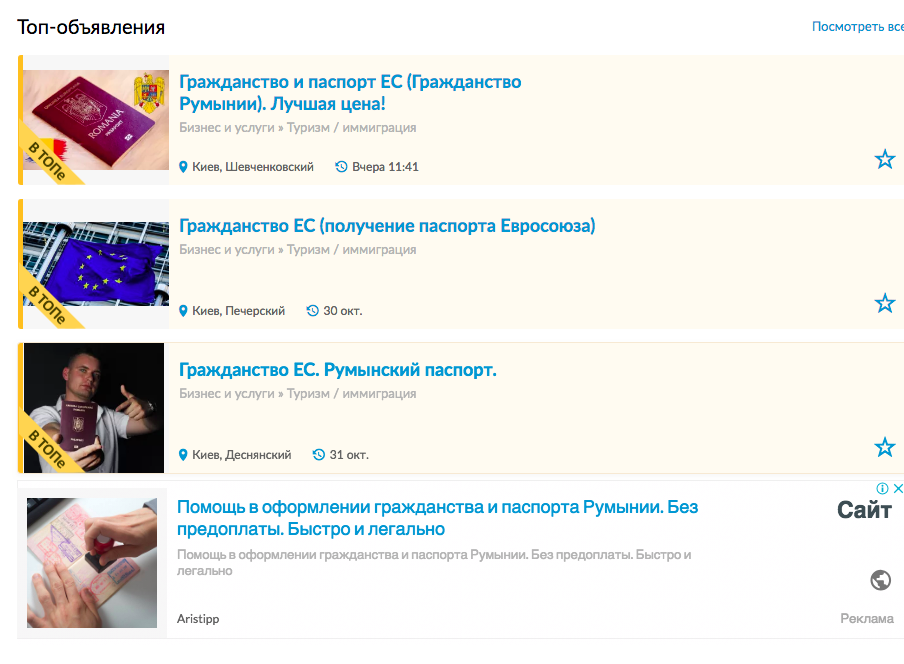В интернете открыто торгуют паспортами стран ЕС. Фото: скриншот с сайта объявлений