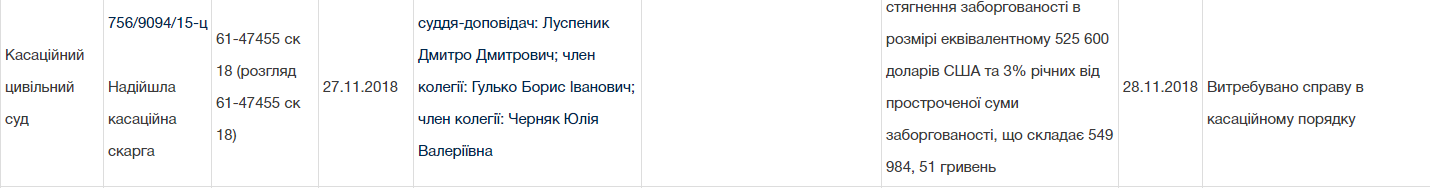 Коллегией в составе докладчика Дмитрия Луспеника, а также "боковых" судей Бориса Гулько и Юлии Черняк истребовано в кассационном порядке производство, а также затребованы в срок до 24 декабря позиции сторон по тяжбе, ведущейся пятый год между влиятельным "нардепом-радикалом" Сергеем Скуратовским и одним из акционеров национализированного банка "Родовид" Сергеем Дядечко.