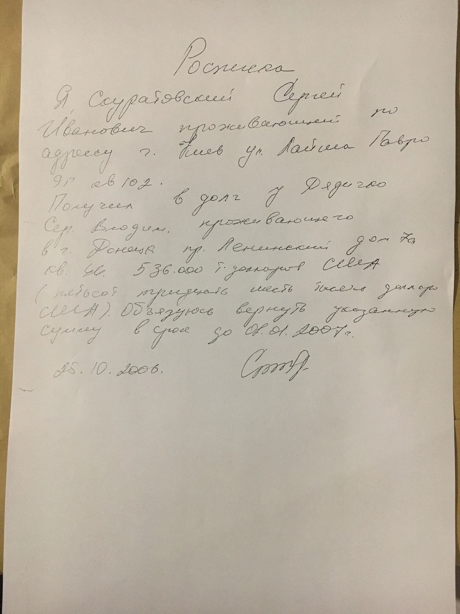 В судебном порядке с 2015 года он пытается добиться возврата ему малой части долгов, составляющей $536 тыс. Это единственный из траншей, в подтверждение которого Дядечко располагает распиской партнера. Он говорит, что ее своей рукой написал директор "Грин-Грея" в киевском офисе банка "Родовид" на улице Сагайдачного осенью 2006 года.