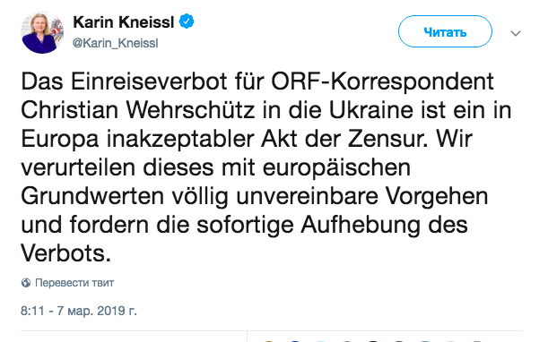 Министр иностранных дел Карин Кнайсль назвала решение украинских властей "недопустимым актом цензуры в Европе".