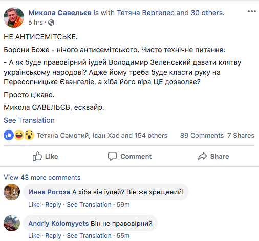 Журналист призывает готовиться к "серьезным выступлениям" против Зеленского. Он же позволили себе антисемитские высказывания на своей странице в Facebook.
