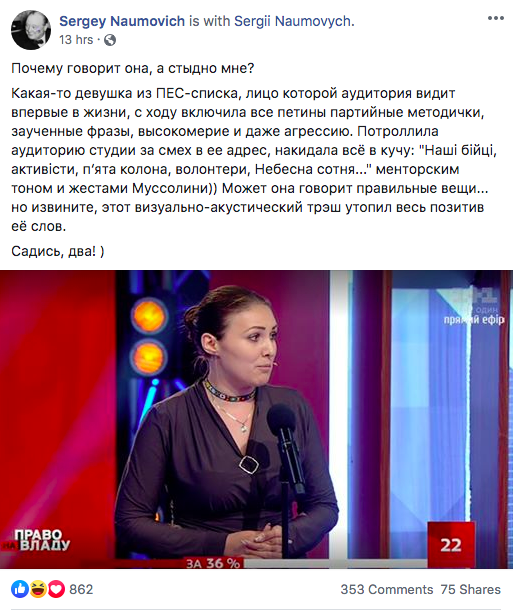 "Почему говорит она, а стыдно мне? Какая-то девушка из ПЕС-списка, лицо которой аудитория видит впервые в жизни, с ходу включила все Петины партийные методички, заученные фразы, высокомерие и даже агрессию. Потроллила аудиторию студии за смех в ее адрес, накидала всё в кучу: "Наші бійці, активісти, п‘ята колона, волонтери, Небесна сотня..." менторским тоном и жестами Муссолини)) Может она говорит правильные вещи... Но извините, этот визуально-акустический трэш утопил весь позитив её слов. Садись, два!", - написал в Facebook киевский блогер Сергей Наумович.