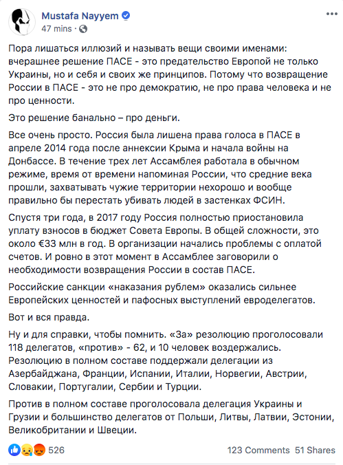"Пора лишаться иллюзий и называть вещи своими именами: вчерашнее решение ПАСЕ - это предательство Европой не только Украины, но и себя и своих же принципов. Потому что возвращение России в ПАСЕ - это не про демократию, не про права человека и не про ценности. Это решение банально – про деньги. Российские санкции "наказания рублем" оказались сильнее европейских ценностей и пафосных выступлений евроделегатов", - написал на своей странице в Facebook нардеп Мустафа Найем.