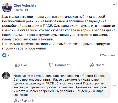 "Как жалко выглядит наша ура-патриотическая публика в своей беспомощной реакции на неизбежное и логичное возвращение российской делегации в ПАСЕ. Слышали скрип, думали, это скрип их извилин, а оказалось, что это скрепят колеса истории, которая давно пошла дальше, пока с трудом думающие ура-патриоты остались в плену своих иллюзий и эмоций. Правильно требуете выхода из Ассамблеи: чётче демонстрируете глубину своего поражения", - написал у себя в Facebook Волошин.