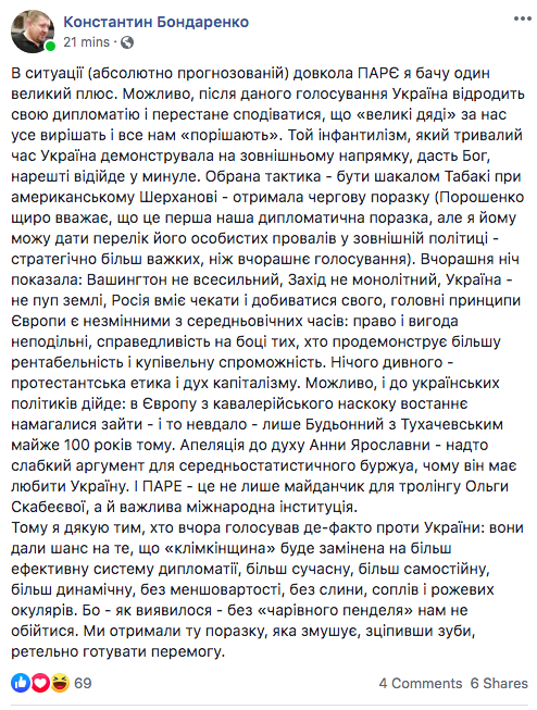 "В ситуации (абсолютно прогнозируемой) вокруг ПАСЕ я вижу один большой плюс. Возможно, после этого голосования Украина возродит свою дипломатию и перестанет надеяться, что "большие дяди" все нам "порешают". Тот инфантилизм, который долгое время Украина демонстрировала на внешнем направлении, даст Бог, наконец отойдет в прошлое. Выбранная тактика - быть шакалом Табаки при американском Шерхан - получила очередное поражение (Порошенко искренне считает, что это первое наше дипломатическое поражение, но я ему могу дать перечень его личных провалов во внешней политике - стратегически более тяжелых, чем вчерашнее голосование)", - пишет политолог Константин Бондаренко на своей странице в Facebook.