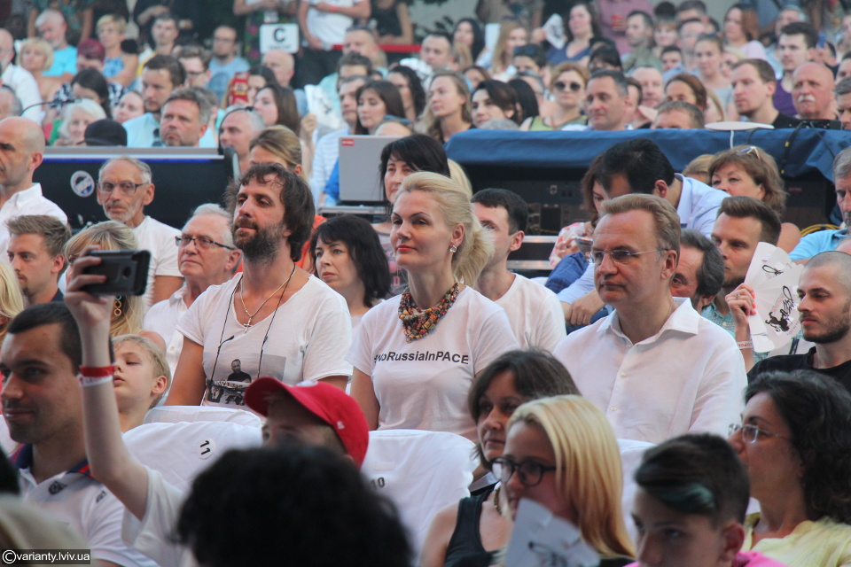 В субботу, 29 июня, на фесте засветился Петр Порошенко с женой Мариной. С утра бывший президент посетил Лычаковское кладбище-музей с могилой погибшего ровно три года назад в АТО местного оперного певца Василия Слипака, где молился и говорил скорбные речи, а через пару часов уже весело зажигал на фестивале.