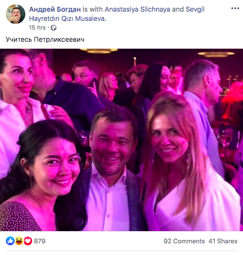 Богдан в Facebook опубликовал фото с той же Мусаевой и хозяйкой фирмы дизайнерской бижутерии Анастасией Сличной и подписал: "Учитесь Петрликсеевич".