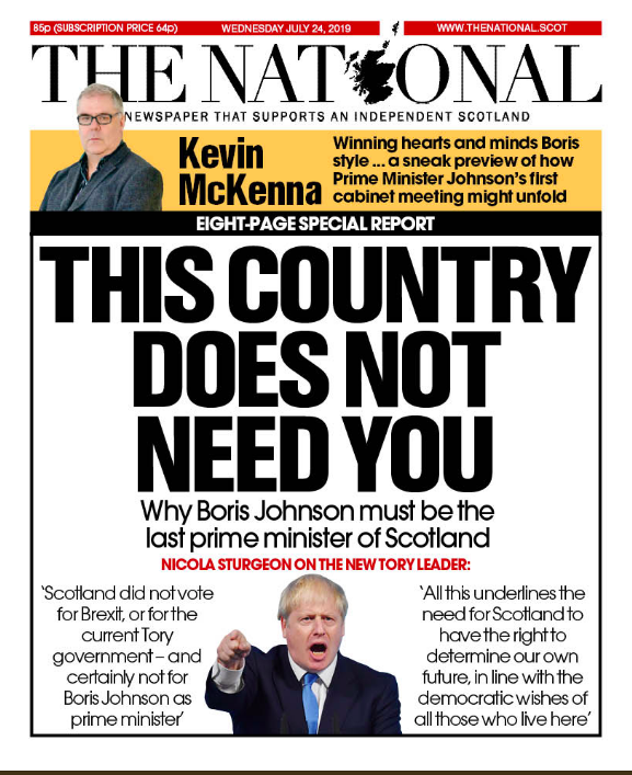 Шотландская газета National уже вышла с громким заголовком на первой полосе: "Эта страна не нуждается в вас". Издание объясняет, почему Джонсон должен стать последним британским премьером этой территории.