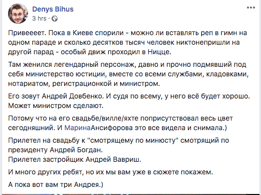Руководитель Офиса президента Андрей Богдан проигнорировал День независимости и улетел на три дня на элитный французский курорт Сен-Тропе – на свадьбу 32-летнего юриста Андрея Довбенко, которого в СМИ называли "смотрящим" за Минюстом во времена Порошенко. Довбенко сыграл свадбу с адвокатом Анной Огренчук.