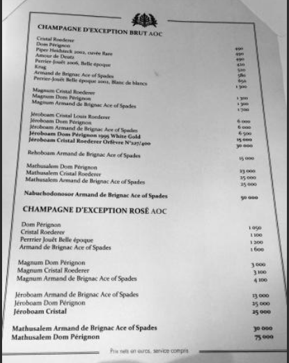Цены шампанского в этом ресторане стартуют от 490 евро за бутылку, что существенно выше средней зарплаты в Украине (390 евро). Максимальная стоимость бутылки розе Dom Perignon – 75 тысяч евро.