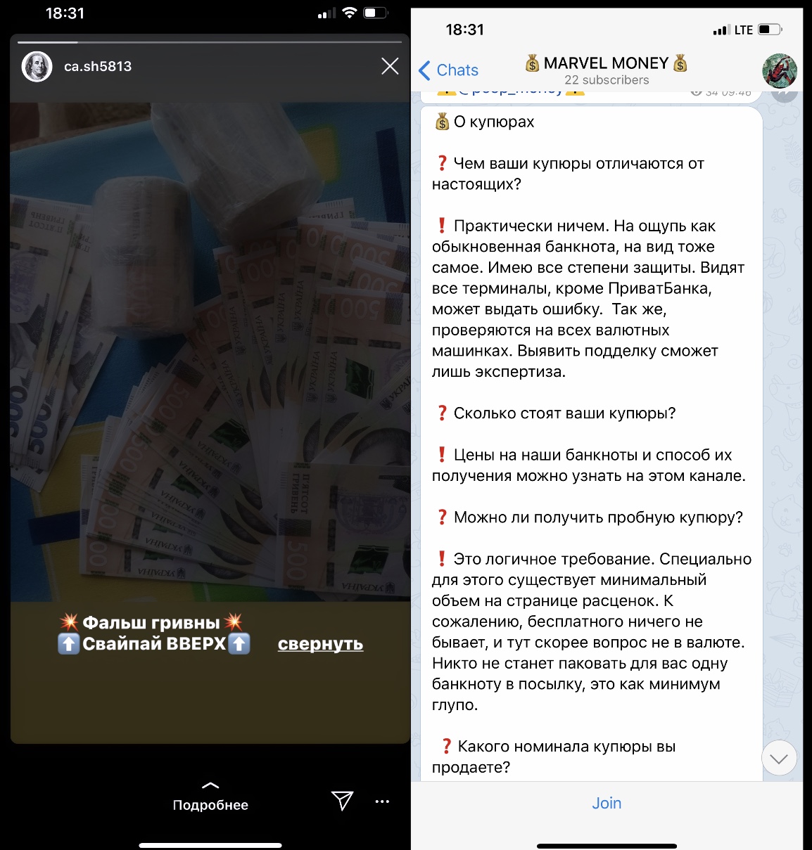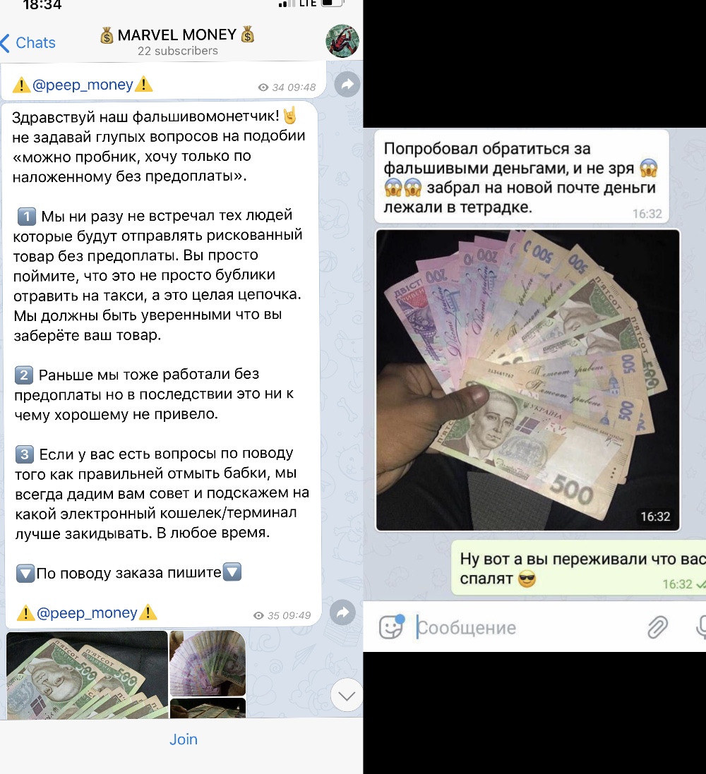 "Фальш гривны. Свайпай верх" - призывала надпись на фоне новеньких 500-гривневых купюр. Ниже была прикреплена ссылка на Telegram-канал. Называется он Marvel money. Всего в Telegram около шести каналов с таким названием, и все они специализируются на одном и том же – продаже фальшивых денег.