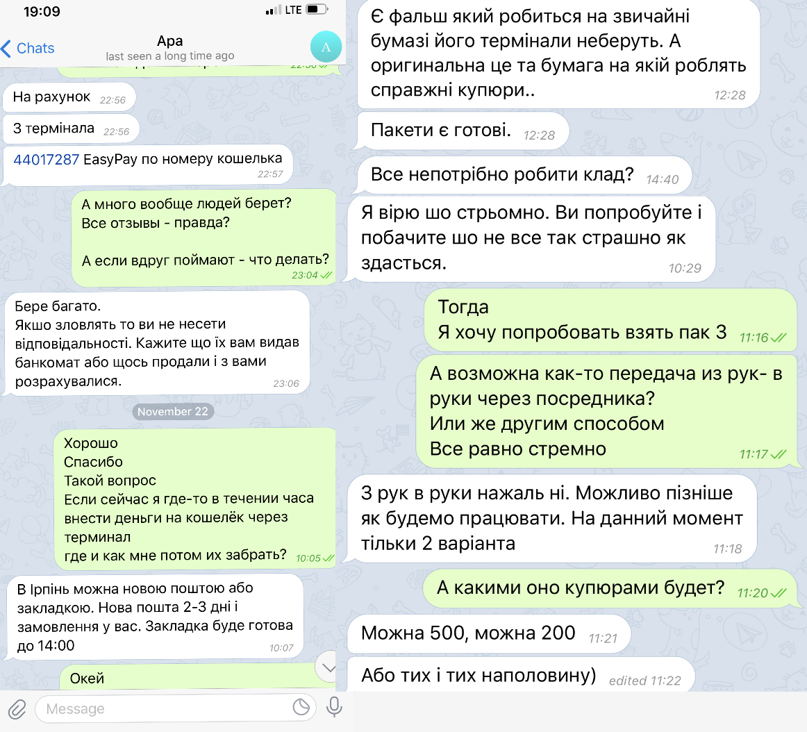 "В Ирпень можно "Новой почтой" отправить или оставить закладку. "Новая почта" идет 2-3 дня, и заказ у вас. Второй вариант – закладка. Она будет готова к 14:00, если оплатите утром. Я понимаю, что стремно, но вы попробуйте и увидите, что все не так страшно, как кажется", – успокаивает меня торговец фальшивыми деньгами.
