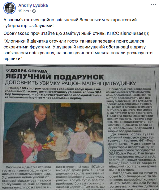Закарпатцы, тем временем, подтрунивают над уволенным Бондаренко, мол, тот запомнился раздачей яблок в детдоме и статьями о себе в советском духе.