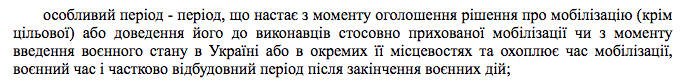 Что касается понятия "особый период", то он регламентируется совершенно другим законом - законом об обороне. В документе говорится, что особый период наступает с момента объявления решения о мобилизации или введения военного положения в Украине (или в отдельных ее местностях), и охватывает время мобилизации или военное время и частично восстановительный период после окончания военных действий.