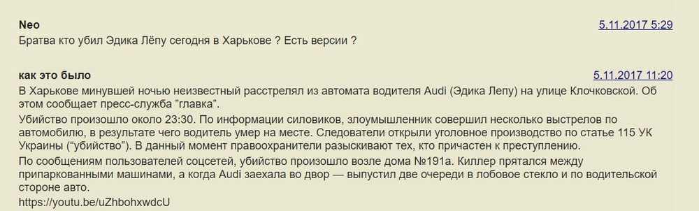 Поздно вечером 4 ноября Харькове из автомата был расстрелян Эдуард Аксельрод - человек с неоднозначной биографией, более известный в некоторых кругах как "Лёпа".
