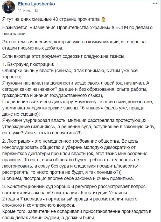 "Люстрация - это немедленное требование общества. Ее цель консолидировать общество и уберечь "новую молодую демократию" от пережитков диктатуры прошлой власти. Этот тезис мне особенно нравится, - анализирует аргументы правительственного уполномоченного юрист Лёшенко. - То есть, если общество будет требовать эту (нынешнюю - Прим. Ред.) власть не люстрировать, а сразу без суда и следствия посадить/повесить/расстрелять, то никто против не будет, я так понимаю?".