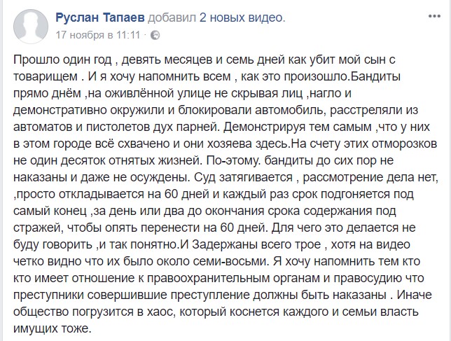 Отец последнего - Руслан Тапаев, также изъявил желание присутствовать на слушании 30 ноября. За две недели до запланированного заседания на своей странице в Facebook он сетовал, что виновные в совершении преступления за почти два года так и не понесли заслуженного наказания.