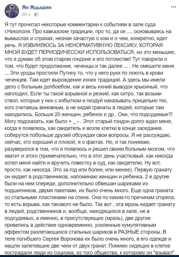 "Первую гранату он кинул в родственников обвиняемых - женщин и ребенка, две другие были на нем спереди. Дополнительно он был обвешан двумя пакетами шариков из подшипников, а на спине - еще одна граната со стальными пластинами. Она по каким-то причинам сгорела, и взрыва, как такового, от нее не было", - заявляет свою трактовку теракта в храме правосудия Яцышин.