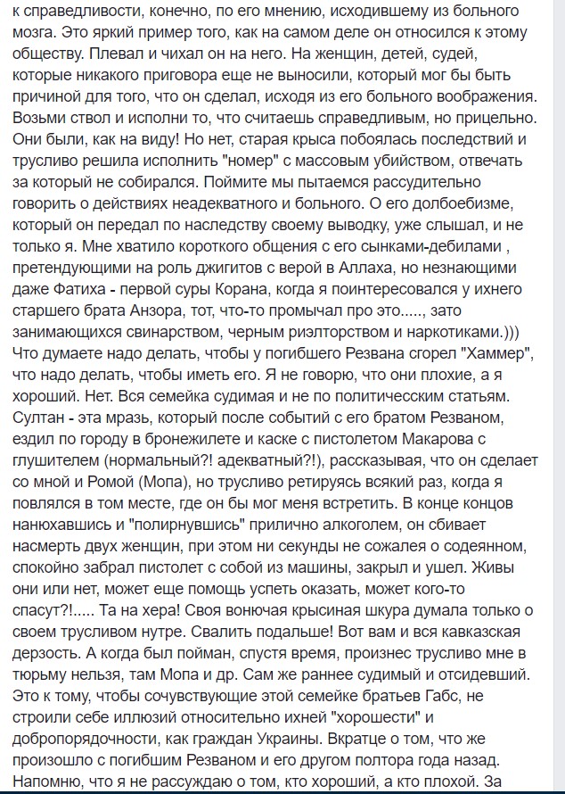 Родственники погибшего эти сведения опровергали. Они подключили влиятельных представителей чеченской диаспоры в Украине (включая главу правления ВГО "Диаспора чеченского народа" Салмана Садаева), которые "освятили" другую версию случившегося.