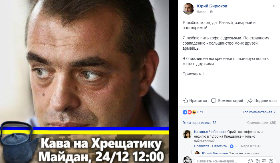 В анонсах к своему мероприятию в Фейсбуке Алексей Петров акцентирует на том, что в кофепитии примут участие украинские воины АТО.