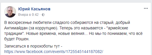 "В воскресенье любители сладкого собираются на старый, добрый Антимайдан (за коррупцию). Теперь это называется - "армейские традиции". Новые времена, новые веяния... Но мы-то понимаем, что всё будет Рошен. Записаться в порохоботы тут", - такой подписью снабдил Касьянов линк на анонс мероприятия в Фейсбуке.