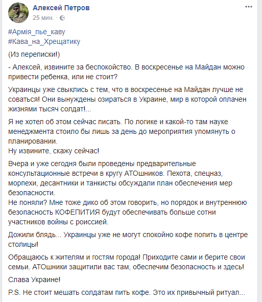 Не поняли? Мне тоже дико об этом говорить, но порядок и внутреннюю безопасность КОФЕПИТИЯ будут обеспечивать больше сотни участников войны с роиссией. Дожили б... Украинцы уже не могут спокойно кофе попить в центре столицы! Обращаюсь к жителям и гостям города! Приходите сами и берите свои семьи. АТОшники защитили вас там, обеспечим безопасность и здесь!" - заверил всех Петров.
