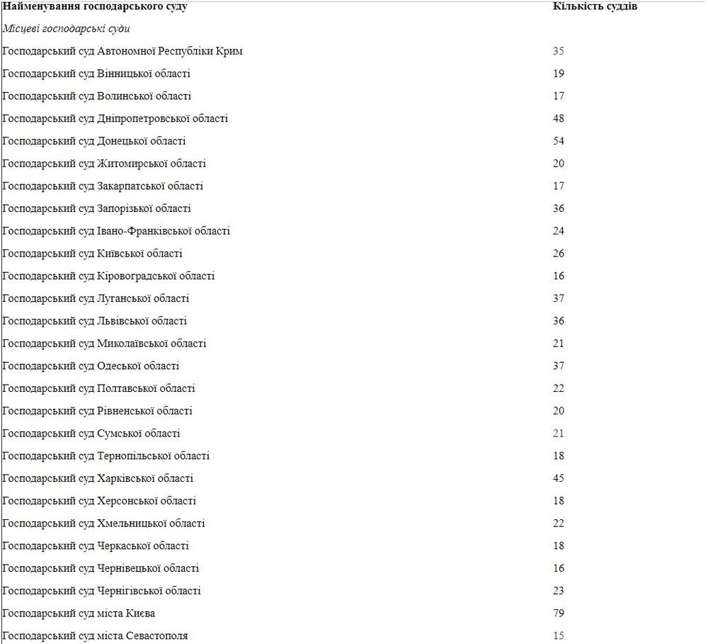 Этим актом закреплены нормы о том, что с 1 сентября прошлого года в 25 работающих хозсудах первой инстанции (без Севастополя и Крыма) устанавливается общая численность судей в количестве 619 человек. А с учетом 225 служителей Фемиды, отправляющих правосудие в апелляционных хозсудах, суммарный состав (без учета ВХСУ) составил 844 судьи хозяйственной юрисдикции. Такая штатная численность называлась в ГСА оптимальной, или же – "модельной".