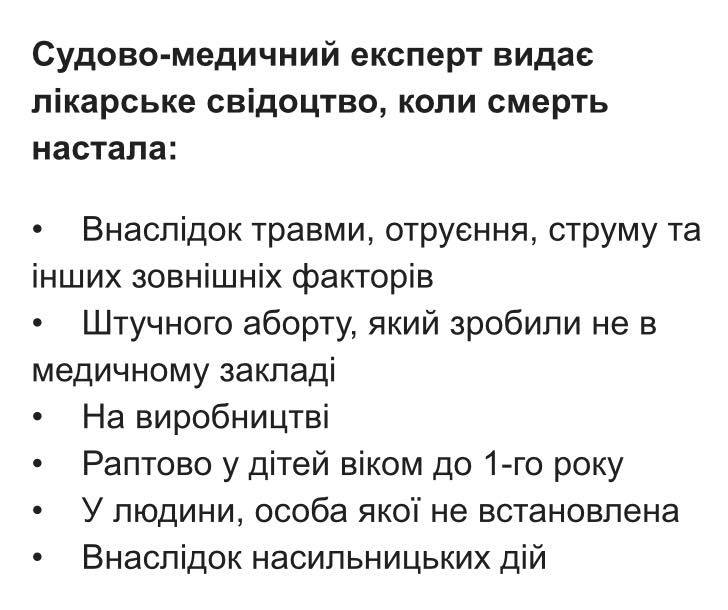 Стандартно читателям при этом напоминали, как "похоронный алгоритм" работает сегодня. Так, в случае смерти человека на место прибывает машина медиков и следственно-оперативная группа. После того как врач констатирует смерть, а следователь открывает уголовное производство, тело покойного отправляют в морг с постановлением на проведение судебно-медицинской экспертизы.