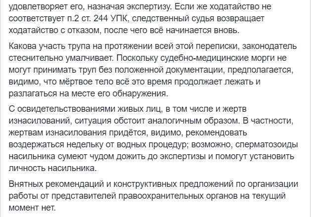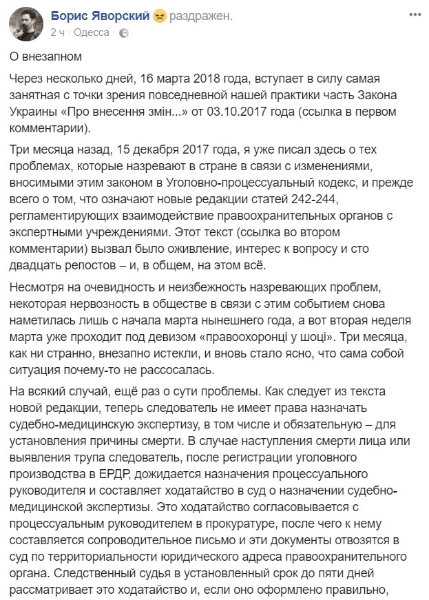 "Теперь следователь не имеет права назначать судебно-медицинскую экспертизу, в том числе и обязательную – для установления причины смерти. В случае наступления смерти лица или выявления трупа следователь, после регистрации уголовного производства в ЕРДР, дожидается назначения процессуального руководителя и составляет ходатайство в суд о назначении судебно-медицинской экспертизы, – поясняет свою логику одесский судмедэксперт Борис Яворский. – Это ходатайство согласовывается с процессуальным руководителем в прокуратуре, после чего к нему составляется сопроводительное письмо и эти документы отвозятся в суд... Следственный судья в установленный срок до пяти дней рассматривает это ходатайство и, если оно оформлено правильно, удовлетворяет его, назначая экспертизу. Если же ходатайство не соответствует п. 2 ст. 244 УПК, следственный судья возвращает ходатайство с отказом, после чего все начинается вновь. Какова участь трупа на протяжении всей этой переписки, законодатель стеснительно умалчивает. Поскольку судебно-медицинские морги не могут принимать труп без положенной документации, предполагается, видимо, что мертвое тело евс это время продолжает лежать и разлагаться на месте его обнаружения".
