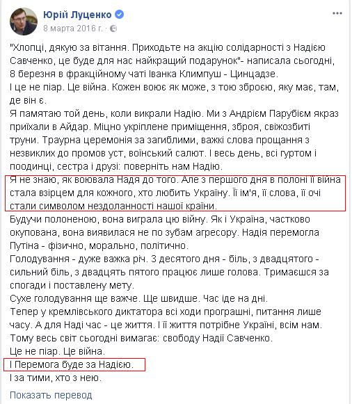 "С первого дня в плену ее война стала образцом для каждого, кто любит Украину. Ее имя, ее слова, ее глаза стали символом непобедимости нашей страны", – написал на своей странице в "Фейсбуке" глава ГПУ, еще будучи председателем фракции президентского именного блока.