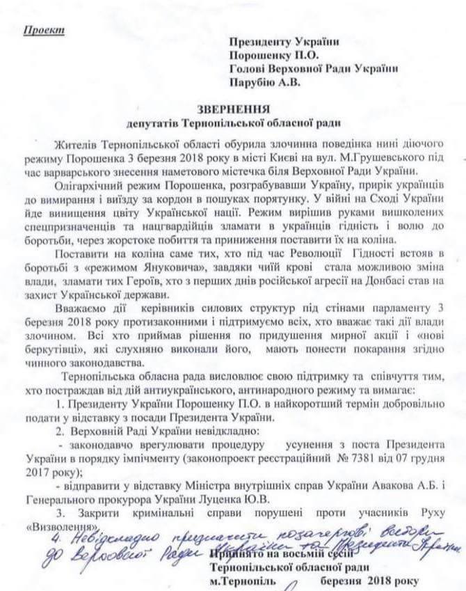 В результате облсовет принял обращение к Порошенко, в котором его призвали добровольно уйти в отставку, а Верховную Раду – принять закон об импичменте и отправить в отставку Авакова и Луценко. Тернопольская облрада также потребовала объявить внеочередные парламентские и президентские выборы.