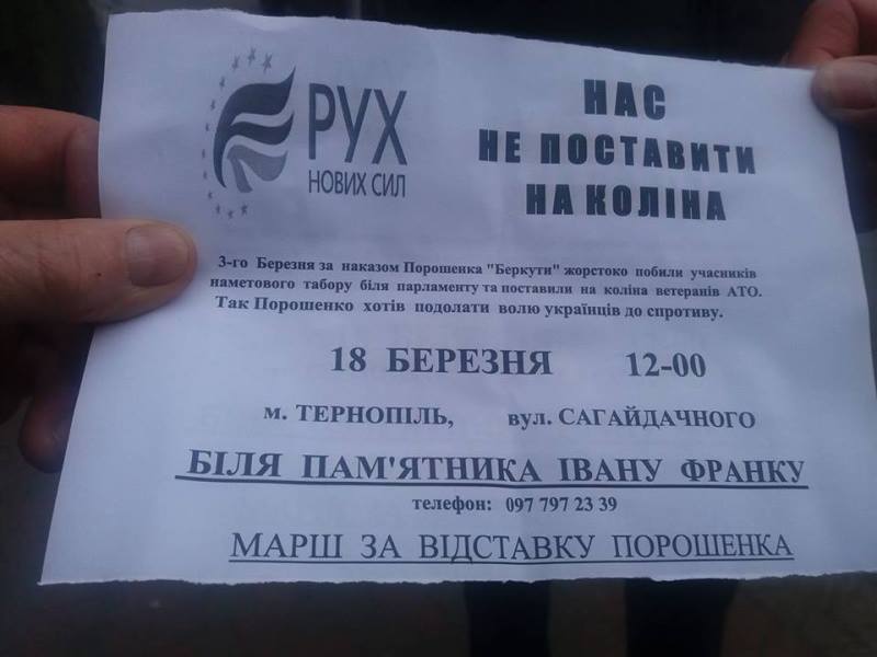 В воскресенье, 18 марта, тернопольские активисты готовятся устроить марш с требованием отставки Порошенко, который организовывает "Рух новых сил" Саакашвили.