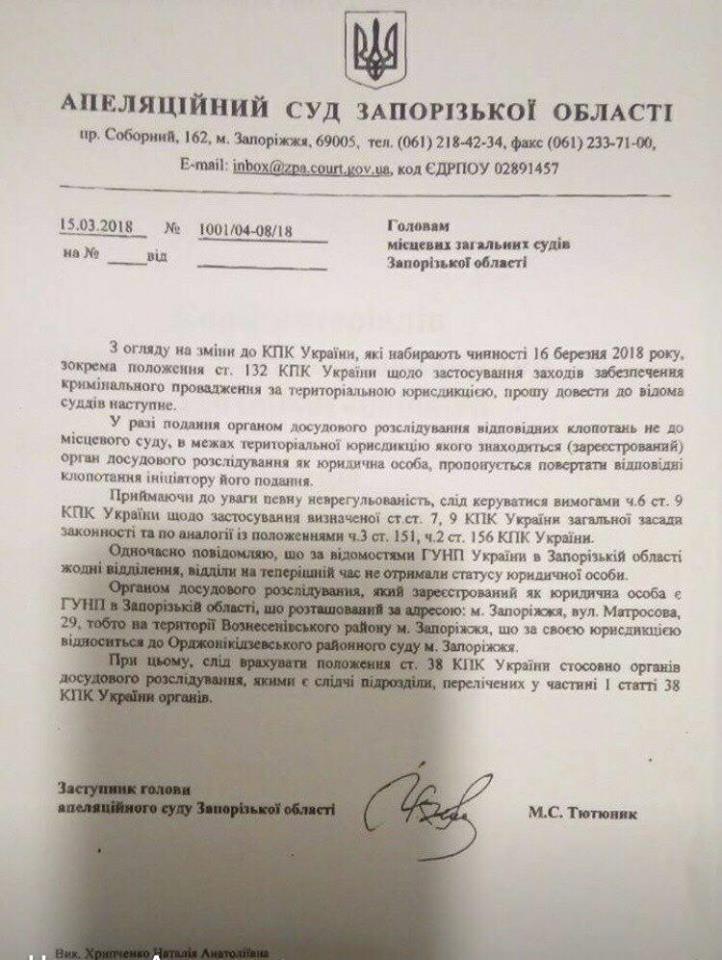 Как готовятся к новшествам в регионах дает понять письмо, спущенное в райсуды Запорожской области местной апелляционной инстанцией. В нем говорится о допущении к приему ходатайств следователей МВД по "свежеоткрытым" уголовным делам исключительно в Орджоникидзевском райсуде, где "прописано" областное управление Нацполиции.