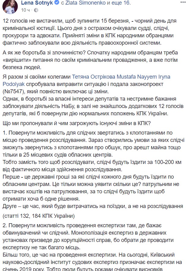 Но, как уже писала "Страна", провести соответствующий законопроект №7547 на текущей неделе его авторам не удалось. Ожидается, что вновь его внесут в повестку дня 20 марта. Противники новаций в УПК не скрывали своего разочарования по поводу провала.
