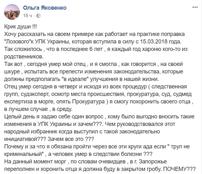 Заметим, что именно в Запорожье назревает и первый громкий скандал, связанный с "похоронной поправкой" УПК. Местная жительница Ольга Яковенко в красках описала, что доведется ей перенести после того, как в день вступления в силу "поправки Лозового" после продолжительной болезни скончался ее отец.