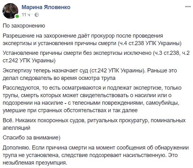 "Расследуются, то есть осматриваются и подлежат экспертизе, только трупы, смерть которых может свидетельствовать о насилии или о подозрении на насилие - с телесными повреждениями, самоубийцы, умершие при странных обстоятельствах и так далее. Всё. Если причина смерти на момент сообщения об обнаружении трупа не установлена, следствие подозревает насильственную. Это незыблемая презумпция. Никаких похоронных судов, ритуальных прокуратур, поминальных апелляций", - пишет на этот счет в Facebook начальник отдела Управления надзора в уголовном производстве прокуратуры Харьковской области области Марина Яловенко.