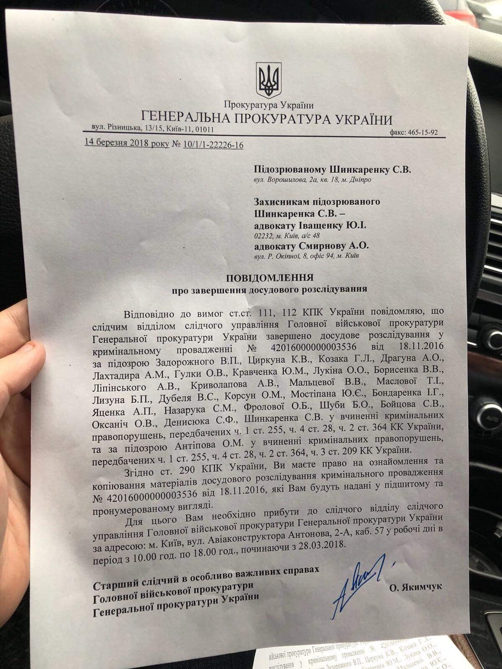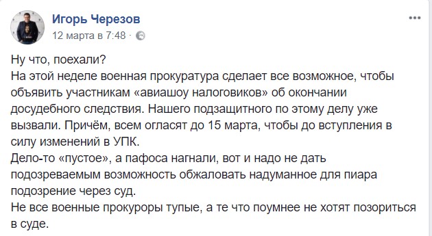 "На этой неделе военная прокуратура сделает все возможное, чтобы объявить участникам «авиашоу налоговиков» об окончании досудебного следствия. Нашего подзащитного по этому делу уже вызвали. Причем, всем огласят до 15 марта, чтобы до вступления в силу изменений в УПК", – писал на этот счет в Facebook адвокат одного из подозреваемых Игорь Черезов.