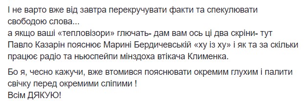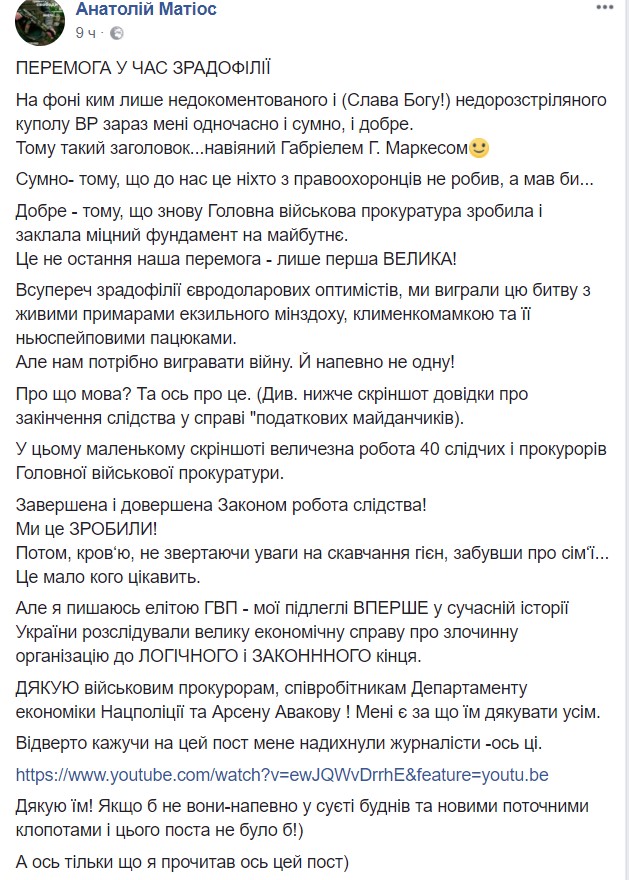 В прокуратуре поначалу взяли паузу и не спешили объяснять мотивы своих действий. Затянувшееся молчание поздно вечером в понедельник, 19 марта, прервал замглавы ГПУ – главный военный прокурор Анатолий Матиос. Он написал запутанный пост в Facebook, среди прочего акцентировав внимание на завершении следствия по делу налоговых площадок.