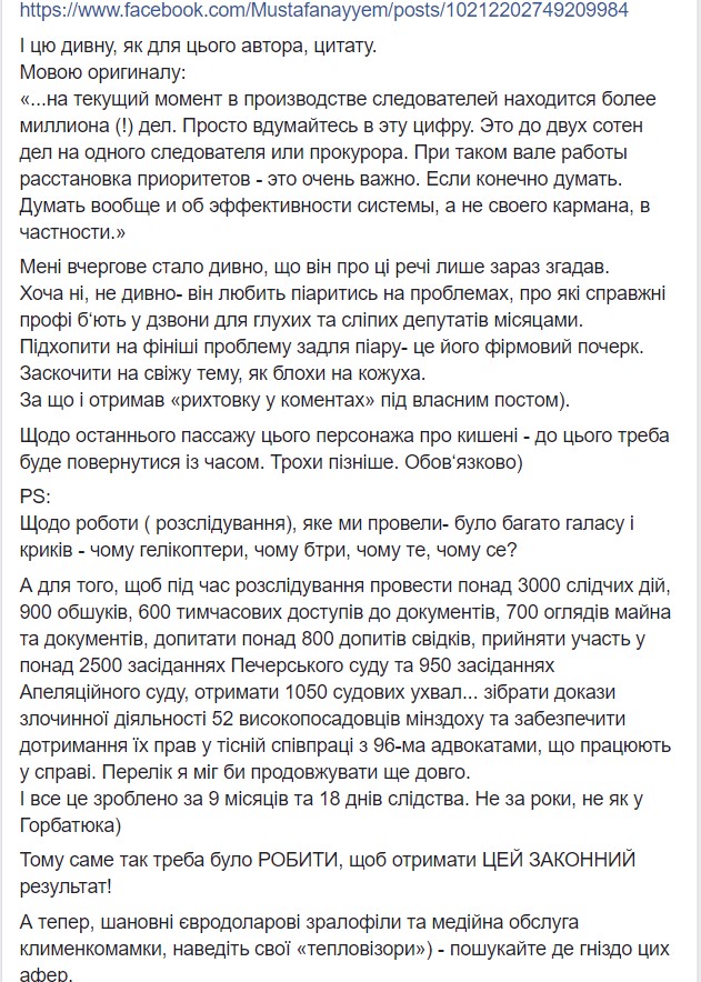 "Что касается работы (расследования), которую мы провели – было много шума и криков: почему вертолеты, почему БТРы... А для того, чтобы во время расследования провести более 3000 следственных действий, 900 обысков, 600 временных доступов к документам, 700 осмотров имущества и документов, осуществить свыше 800 допросов свидетелей, принять участие в более чем 2500 заседаниях Печерского суда и 950 заседаниях Апелляционного суда, получить 1050 судебных решений... собрать доказательства преступной деятельности 52 чиновников Минсдоха и обеспечить соблюдение их прав в тесном взаимодействии с 96 адвокатами, которые работают по делу. Список я мог бы продолжать еще долго. Все это было сделано за 9 месяцев и 18 дней следствия", – резюмировал главный военный прокурор.
