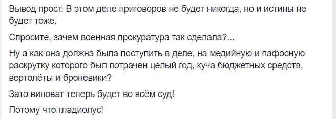 На фоне этого объявление о завершении досудебного расследования данного уголовного производства было сделано более чем скромно. Несколько дней информацию об этом "придерживали" официальные спикеры ГПУ, молчали и лояльные к ним "говорящие головы" в соцсетях. В результате лишь накануне вечером был выдан информационный залп, в котором рапортуется об успехе "военки", а итоговая картина по делу заявляется как "перемога під час зрадофілії".