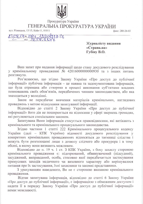 В августе прошлого года в Бюро отказались комментировать "Стране" "дело Сытника", переадресовав нас в Генпрокуратуру. Здесь также не ответили по сути задаваемых вопросов о громкой истории, ограничившись отпиской.