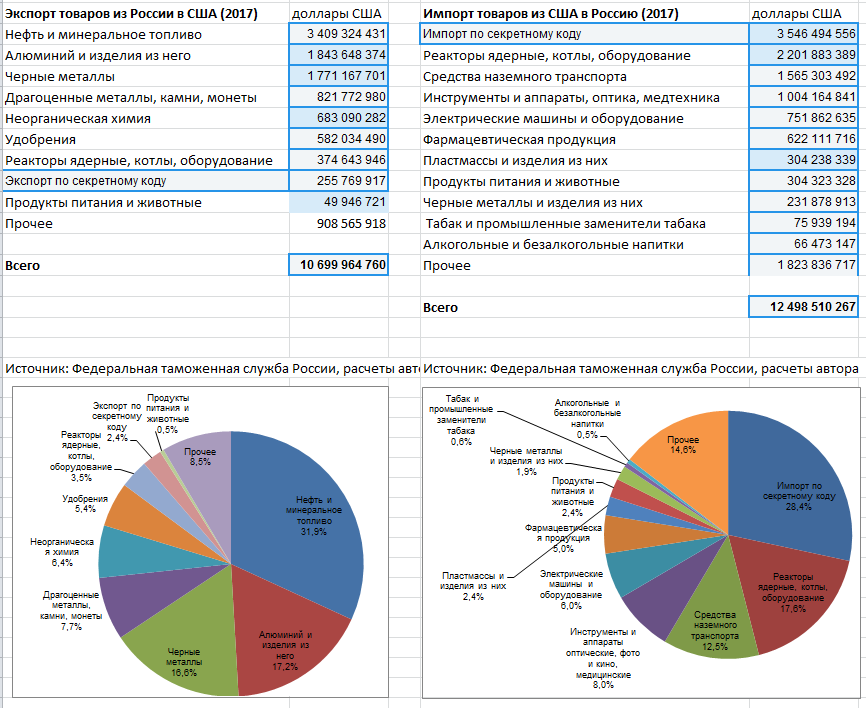 В прошлом году Штаты поставили в Россию товаров на $3,5 млрд, которые Федеральная таможенная оценила как импорт по секретному коду. Это свыше четверти импорта из США. Вероятно, товары двойного назначения. Также наглядно видно, что техника, технологии, лекарства составляют немалую долю в поставках. Ограничивать такой импорт - наказывать самих себя.