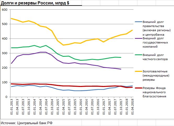 Как сообщает Центробанк России, на 1 апреля 2018 года внешний долг страны составлял $525 млрд, однако госорганы и центробанк должны лишь 14% этой суммы.