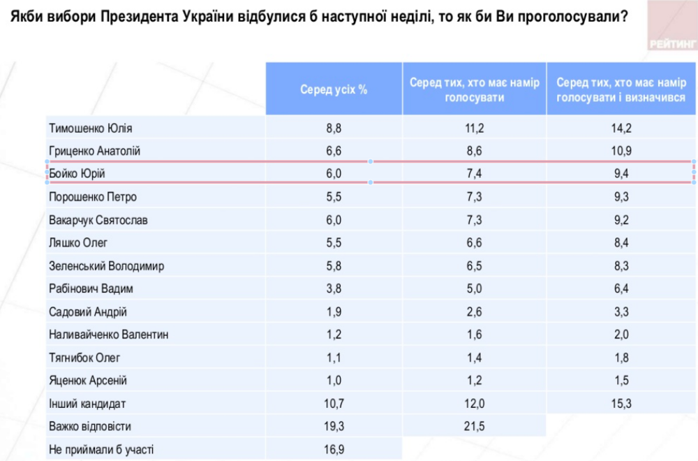 Среди тех, кто точно намерен голосовать, тройка лидеров неизменна: Юлия Тимошенко - около 11,2%, Анатолий Гриценко - 8,6%, Юрий Бойко (7,4%). У Святослава Вакарчука и Петра Порошенко - по 7,3% голосов, у Владимира Зеленского - 6,5%.