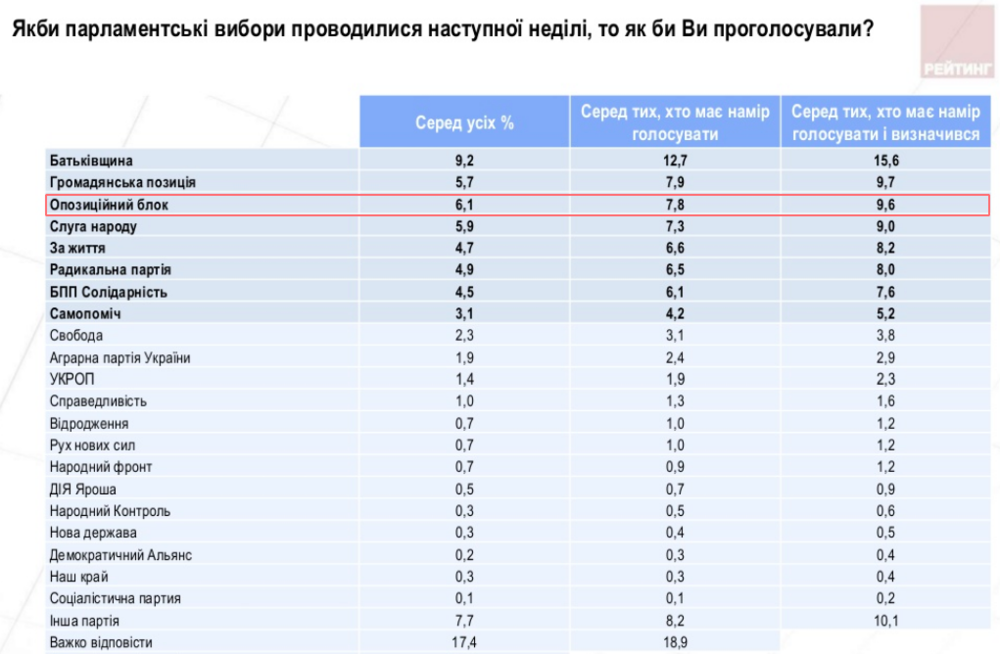 Еще более очевиден этот феномен в рейтингах политических партий. Например, среди всех рейтинг "Оппозиционного блока" - второй после "Батькивщины". А среди тех, кто имеет намерение прийти на выборы и проголосовать, - уже третий.
