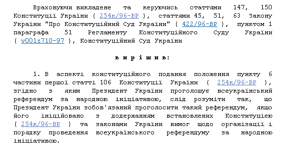 По статье 106 Конституции, провозгласить всеукраинский референдум по народной инициативе должен президент. Конституционный суд разъяснил, что это его прямая обязанность: