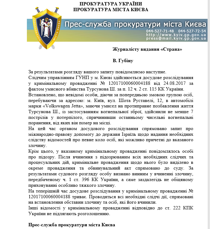Это же следует и из ответа на запрос "Страны", полученного в прокуратуре Киева по делу об убийстве накануне Дня Независимости. В столичном надзорном ведомстве подтвердили, что направили запрос о международной правовой помощи на Землю Обетованную в части оказания содействия для получения сведений о "конкретном круге лиц, которые возможно причастны к данному преступлению".