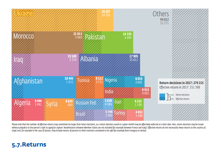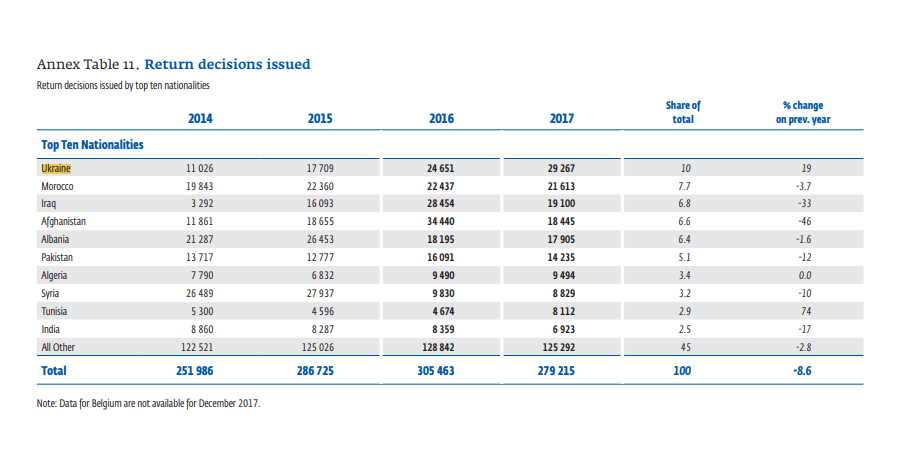 Украина - лидер по числу возвратов. 29 267 решений о депортации было принято в 2017 году по отношению к украинцам. К тому же, количество решений о возвратах в отношении украинцев с каждым годом растет. Из этих решений 24 356 фактически реализованы. По этому показателю мы занимаем второе место после Албании, которая также имеет безвизовый режим с Евросоюзом.